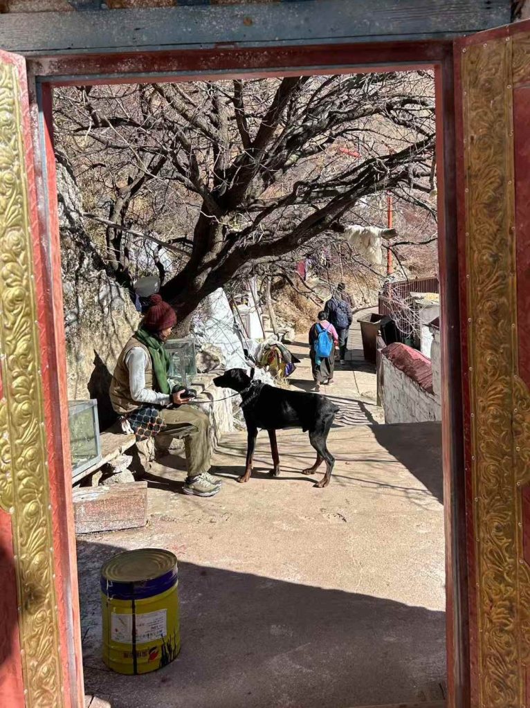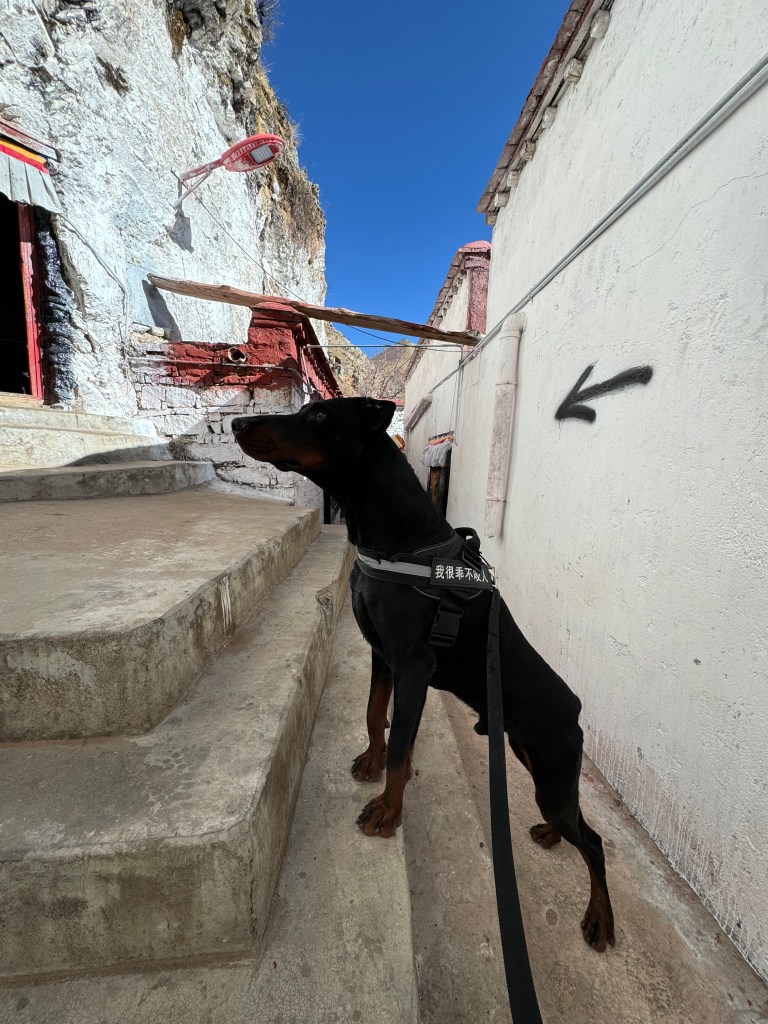 狗子也很争气,我们带它去各个寺庙的时候,它没有惹过任何事情。在色拉寺的马头明王大殿里,我带着它排队去撞法相座,黑黑的长廊里密密麻麻排几百人,这只黑色的大狗挨着我一个多小时都不吵不闹。