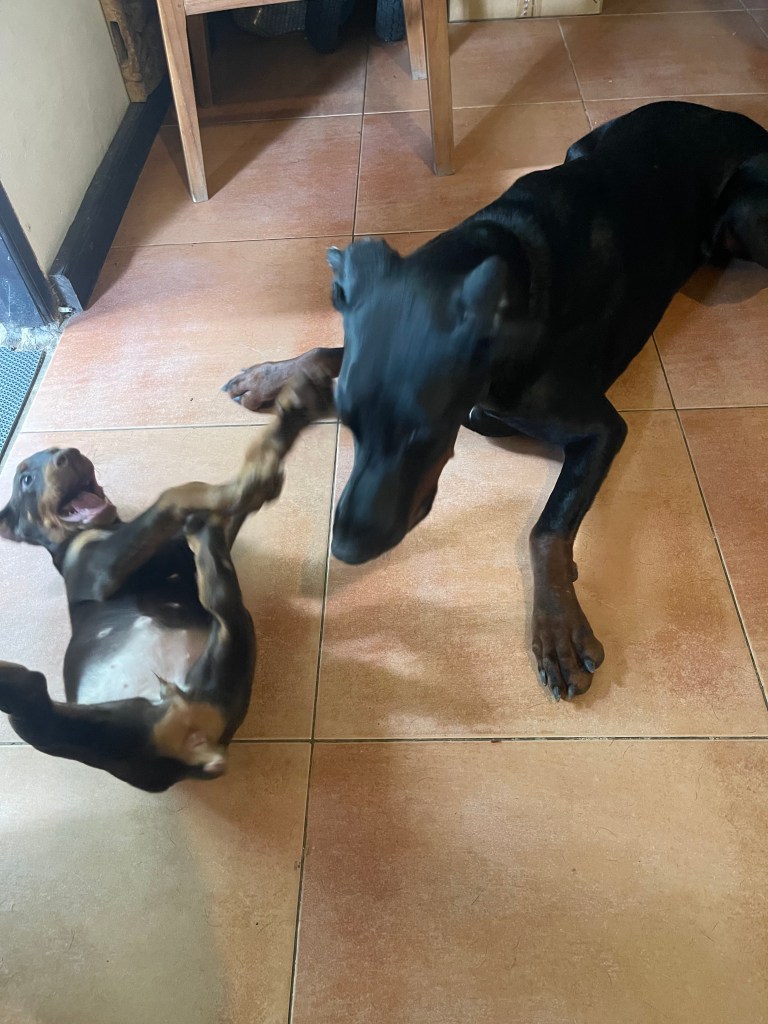 你看,这是你的小妹妹,她跟你一样是个杜宾,是来跟你作伴的。免得你一个人,啊不,一条狗无聊。她现在还小,等她长大了就跟你一样了,以后就都有她跟你一起玩了,多好啊。